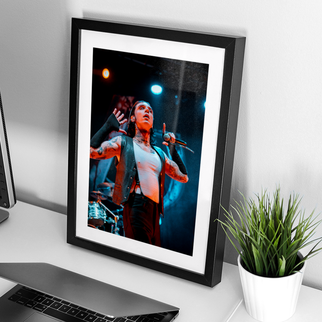 Impreso y enmarcado con acabados profesionales, este cuadro es una pieza imprescindible para fanáticos de Black Veil Brides y coleccionistas de momentos icónicos del rock.