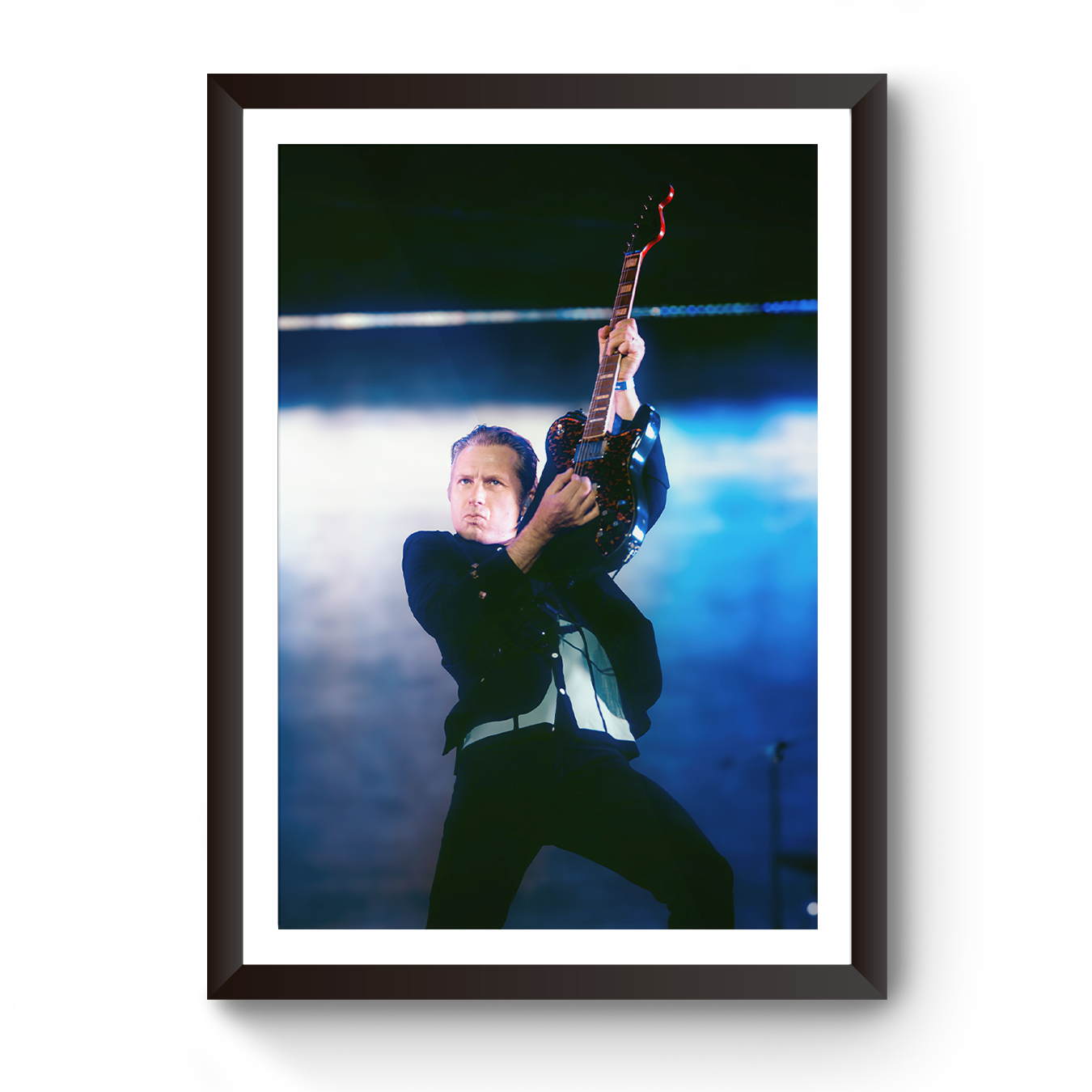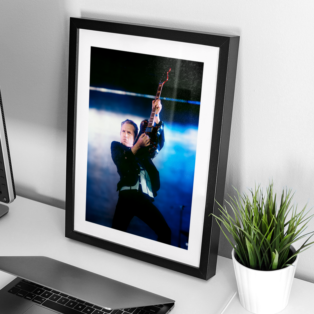 Impreso y enmarcado con acabados profesionales, esta imagen inmortaliza la energía magnética de Alex Kapranos y el lazo inquebrantable entre Franz Ferdinand y Chile.