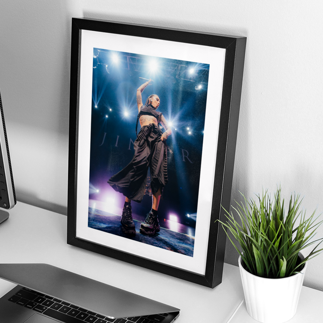 Impreso y enmarcado con acabados profesionales, este cuadro es una pieza imprescindible para fanáticos y coleccionistas de momentos icónicos de la música.