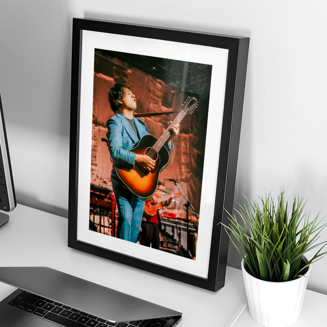 Impreso y enmarcado con acabados profesionales, este momento captura a Francis en plena conexión con la música y el público, recordándonos por qué Los Bunkers siguen dejando huella.