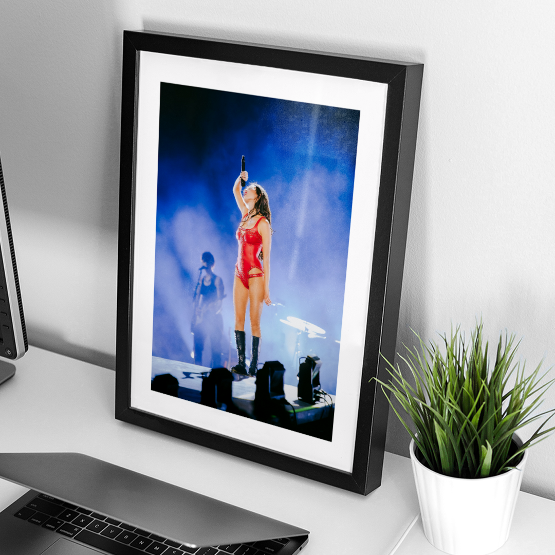 Esta fotografía, impresa y enmarcada con acabados profesionales, resalta cada detalle de la interpretación de Olivia, desde su expresión apasionada hasta la dinámica iluminación que la rodea, convirtiéndose en un recuerdo imprescindible para fans y coleccionistas por igual.