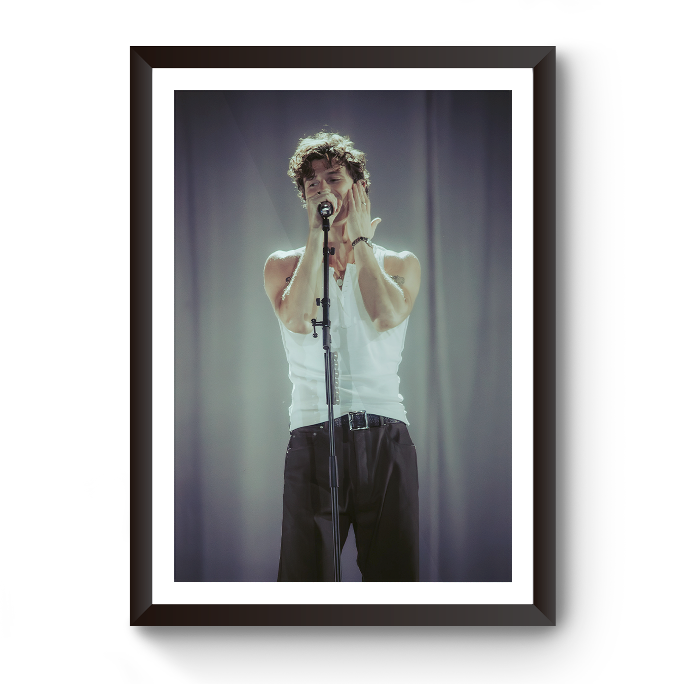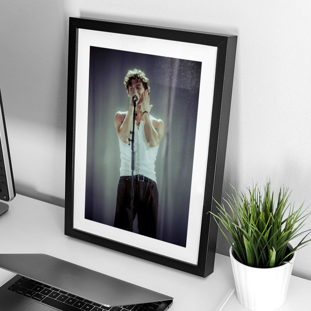 Esta imagen, impresa y enmarcada con acabados profesionales, inmortaliza el carisma y la energía de Mendes en escena, convirtiéndose en una pieza ideal para fans y coleccionistas que quieran atesorar este regreso histórico.